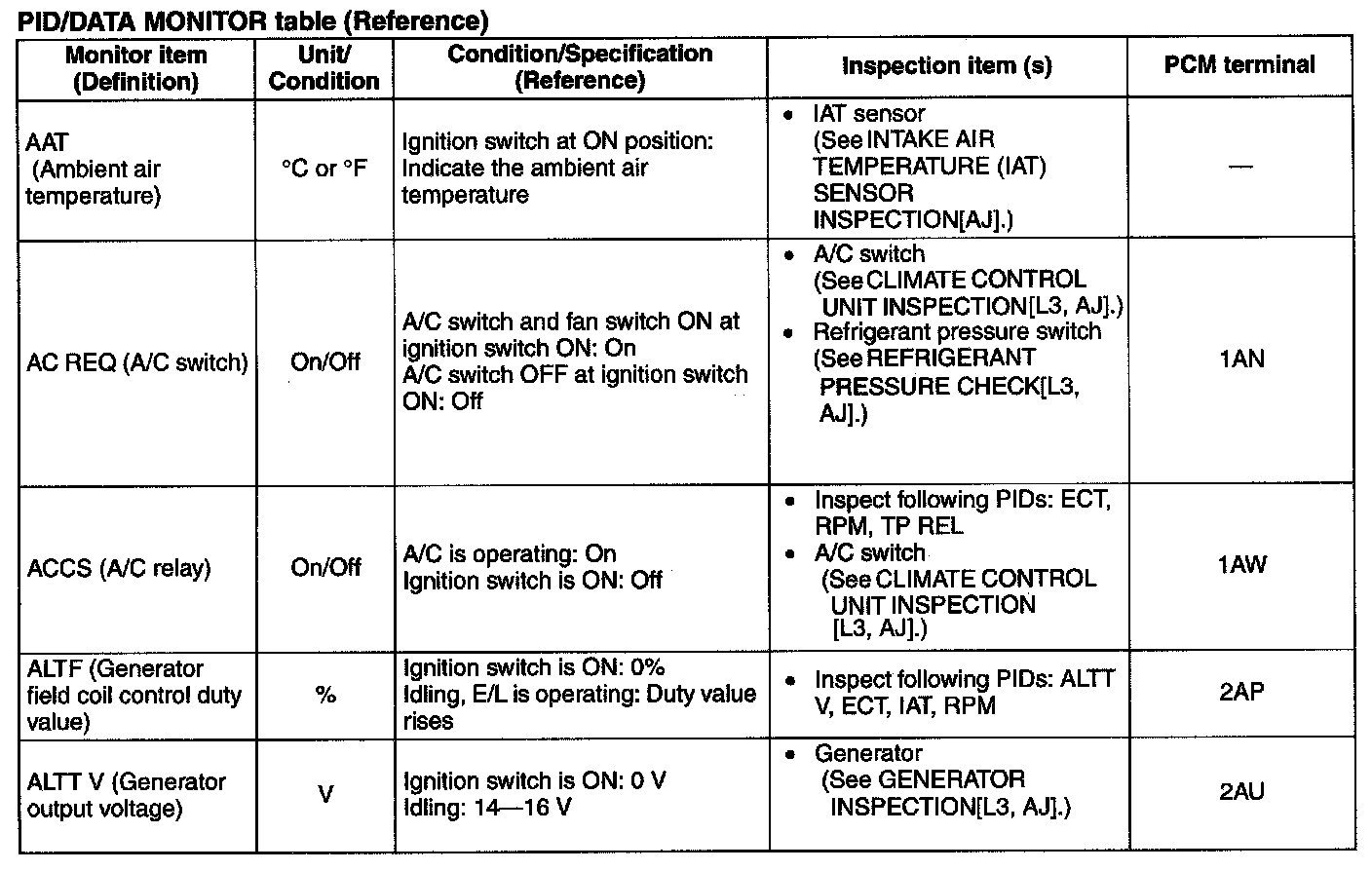PID/DATA Monitor Table (Reference)