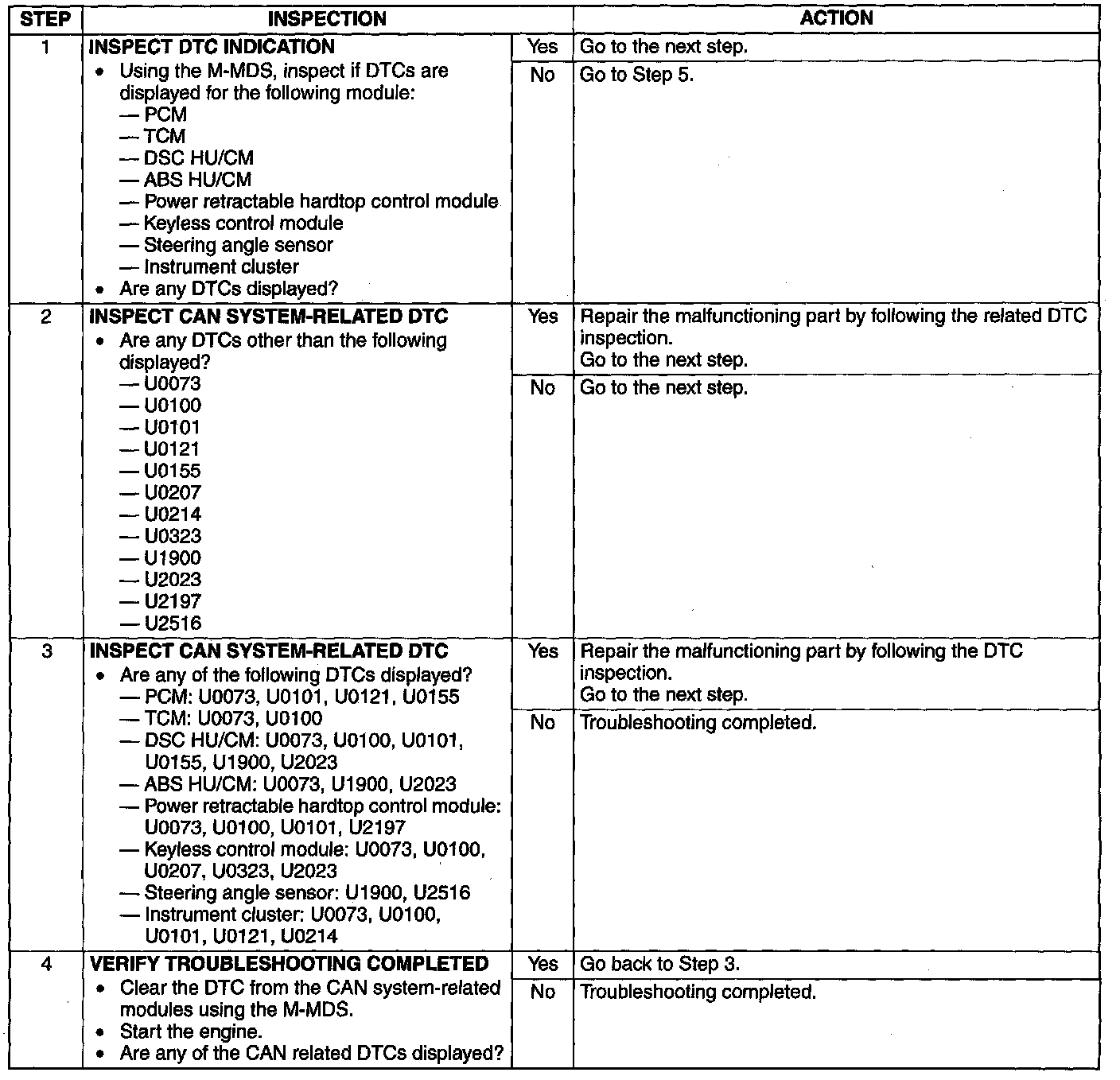 - If the controller area network (CAN) system is malfunctioning, read the DTCs of the following modules, using the M-MDS to determine the malfunctioning system.