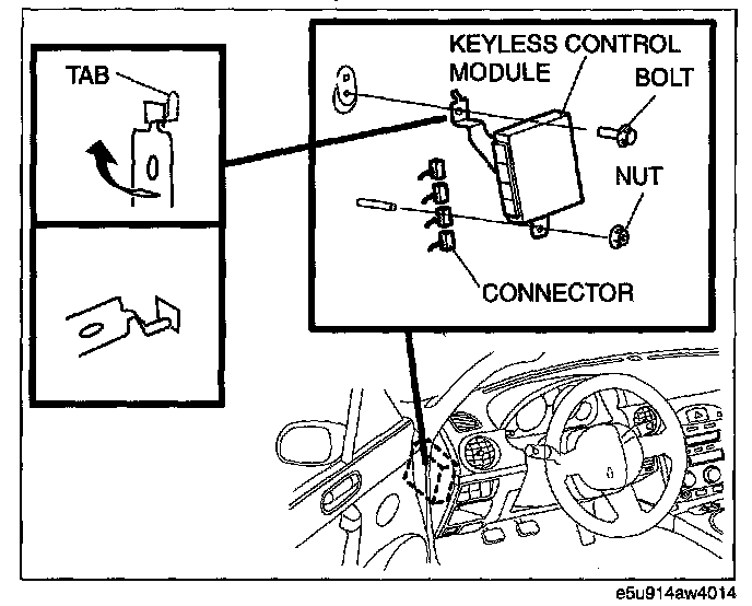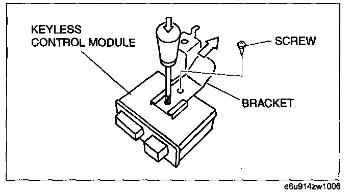 NOTE: The screw which fixes the keyless control module and bracket is for a body ground connection. Be sure to secure the screw when installing.
