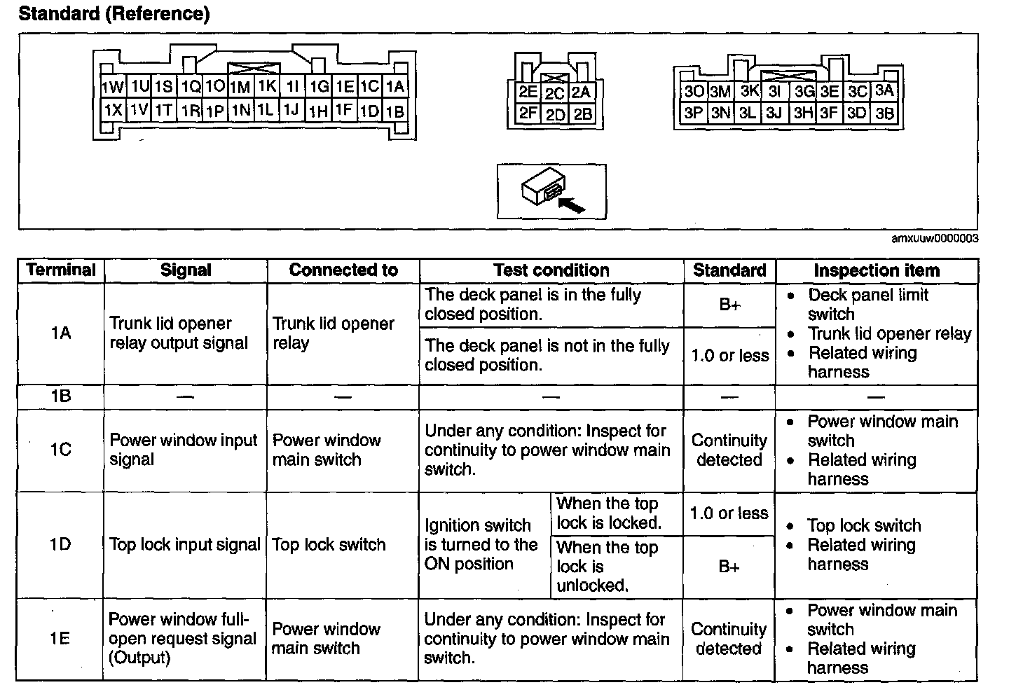 2. Attach the tester lead to the power retractable hardtop control module wiring harness-side connector and inspect voltage, continuity, or resistance according to the standard (reference) on the table.