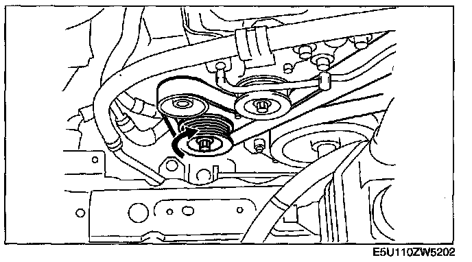 2. Rotate the drive belt auto tensioner in the direction shown in the figure and remove the drive belt.