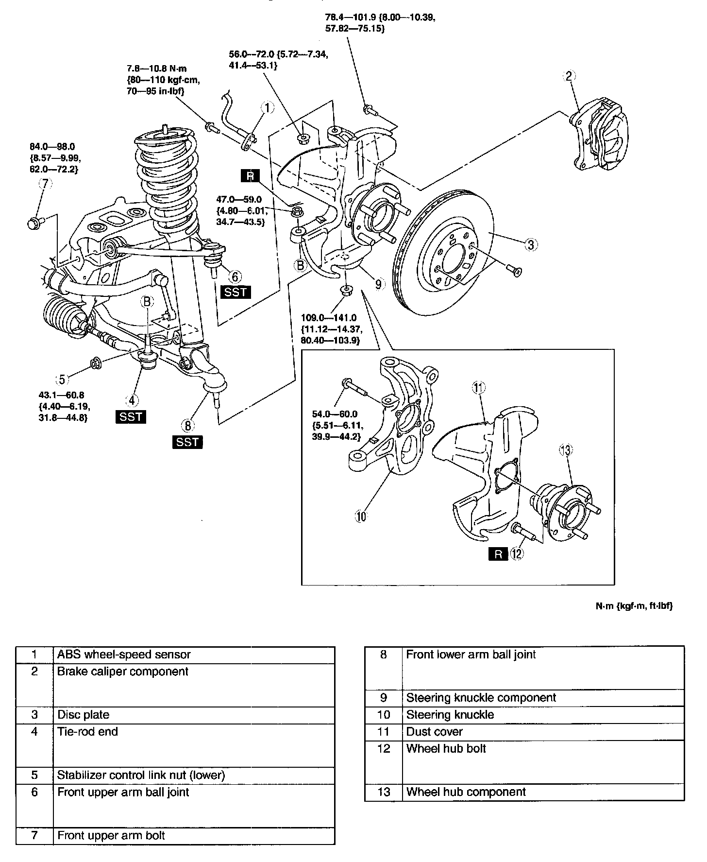 WHEEL HUB, STEERING KNUCKLE REMOVAL/INSTALLATIONCaution: Performing the following procedures without first removing the ABS wheel-speed sensor may possibly cause an open circuit in the wiring harness if it is pulled by mistake. Before performing the following procedures, disconnect the. ABS wheel-speed sensor harness connector (axle side) and fix it to an appropriate place where the sensor will not be pulled by mistake while servicing the vehicle.