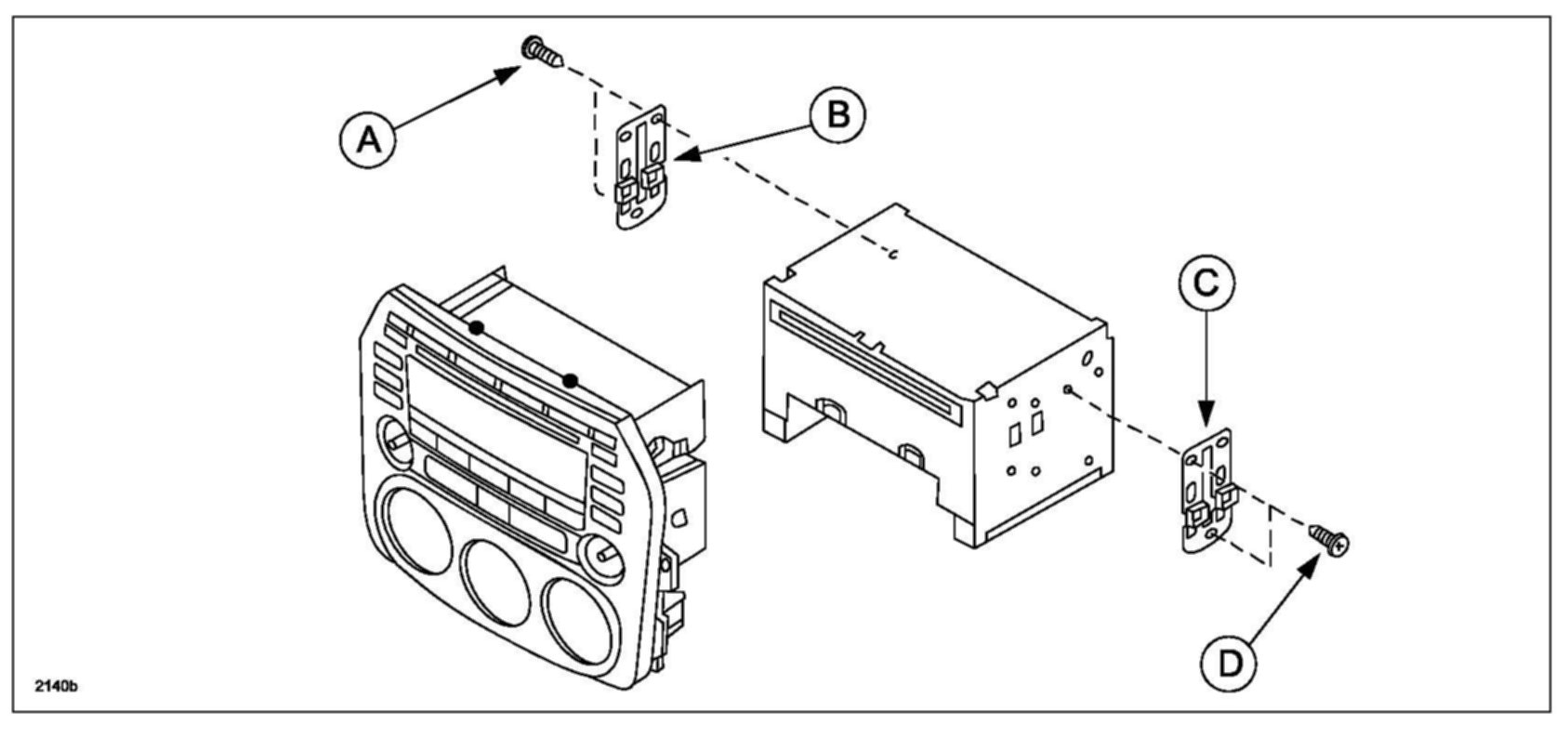 4. Reinstall using new audio brackets (B and C) and screws (A and D) in reverse order of removal.
