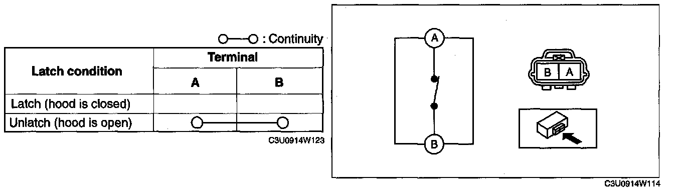 2. Inspect for continuity between the hood latch switch terminals.