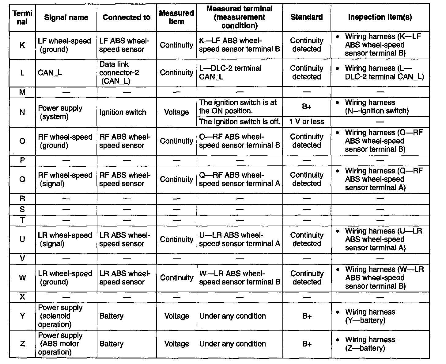 3. Attach the tester lead to the ABS HU/CM wiring harness-side connector, then inspect the voltage, continuity, or resistance according to the standard (reference) on the table.