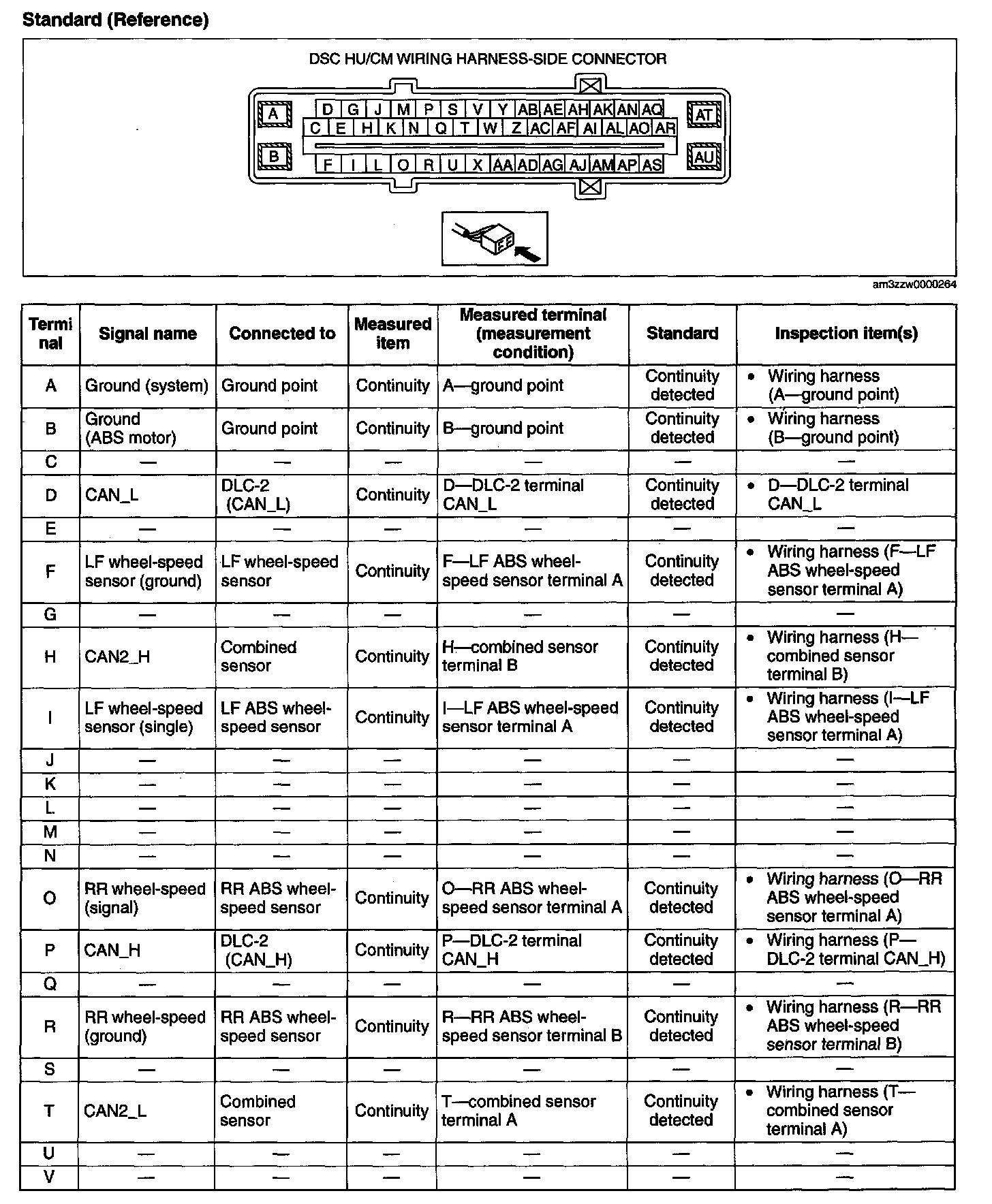3. Attach the tester lead to the DSC HU/CM wiring harness-side connector and inspect voltage, continuity, or resistance according to the standard (reference) on the table.