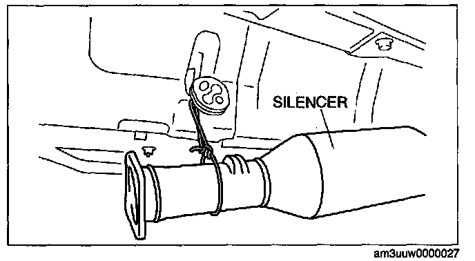 3. Disconnect the hanger rubber except for the one installed to the rear end of the vehicle from the silencer, and suspend the silencer using rope.