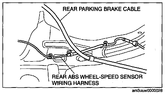 1. Pass the rear parking brake cable inside the rear ABS wheel-speed sensor wiring harness as shown in the figure.