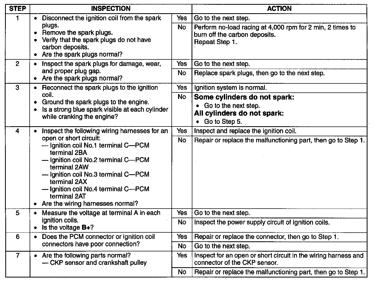 WARNING: High voltage in the ignition system can cause strong electrical shock which can result in serious injury. Avoid direct contact to the vehicle body during the following spark test.