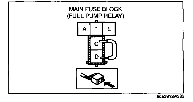 2. Using a jumper wire, short fuel pump relay terminals C and D and connect the negative battery cable to start the fuel pump.