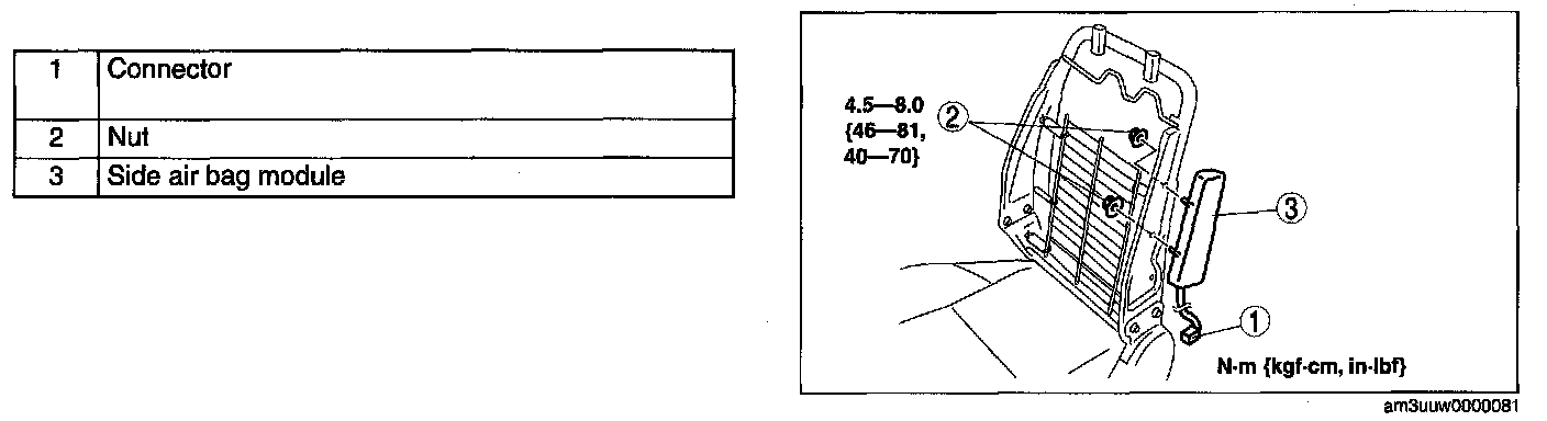 - If the side air bag module is installed with debris in the seat back, the foreign material may be scattered when the side air bag module operates (deploys), causing injury. Verify that there is no foreign material in the seat back before installing the side air bag module.