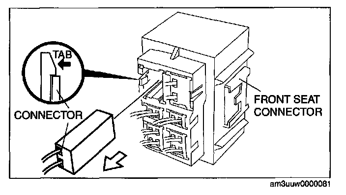 1. Detach the tab as shown in the figure and remove the connector from the front seat connector.