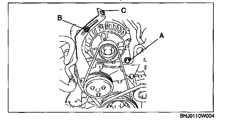 3. Adjust the drive belt deflection and tension by turning adjusting bolt C to the specification.