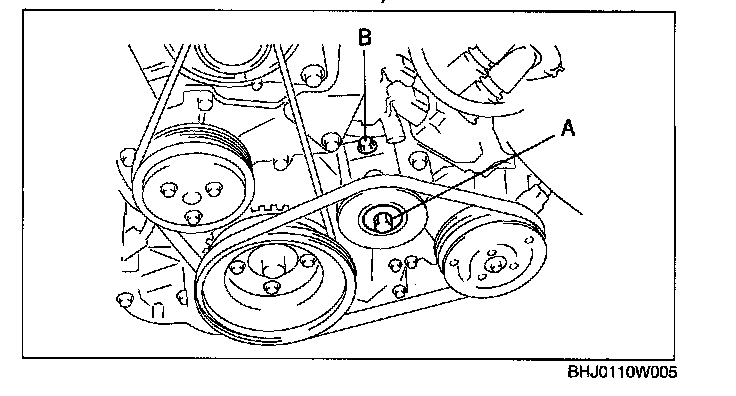 3. Adjust the drive belt deflection and tension by turning adjusting bolt B to the specification.