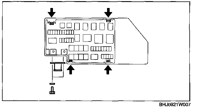 1. Press the tabs in the direction indicated by the arrows, lift the main fuse block, and then remove the bolt.