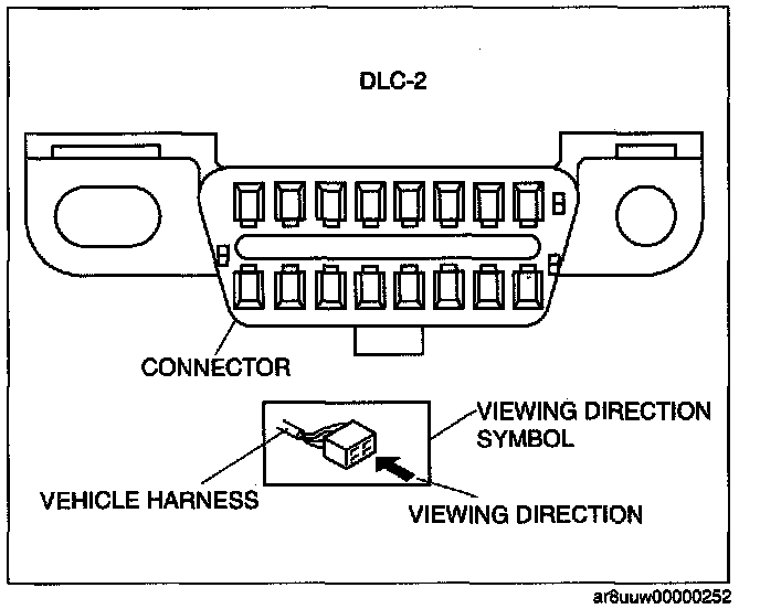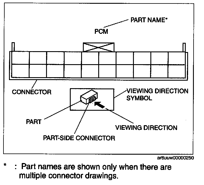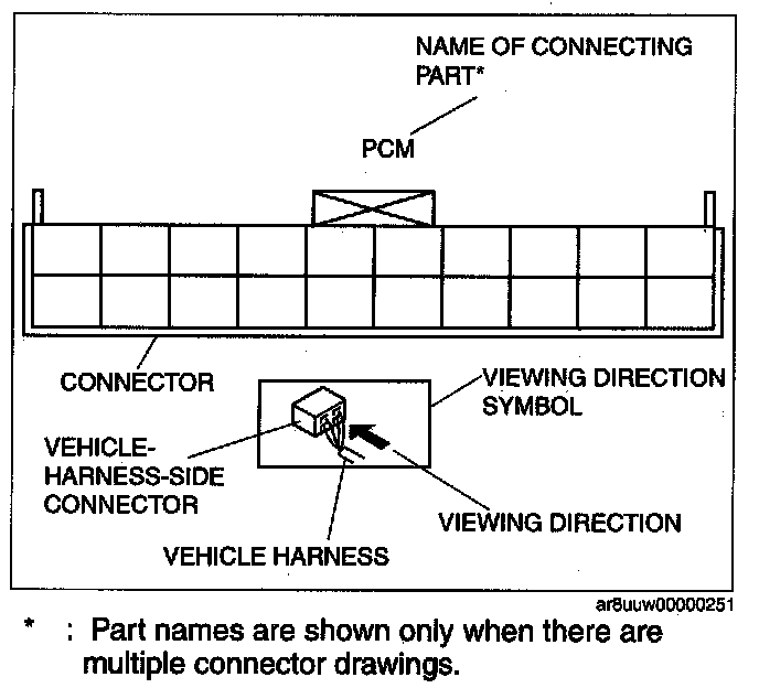 When it is necessary to show the terminal side of vehicle harness-side connectors, such as the following connectors, the viewing direction is from the terminal side.