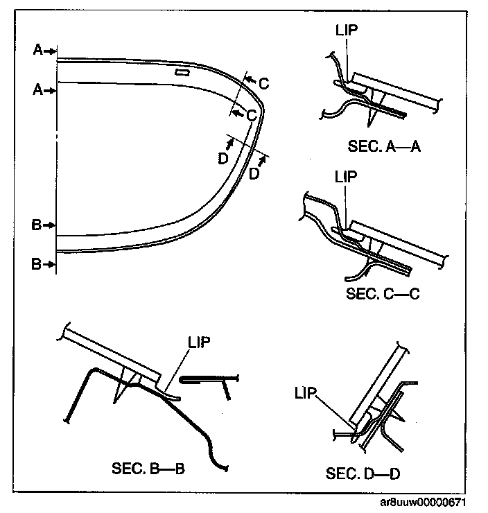 CAUTION: Proper installation of the windshield may be difficult if sealant is cracked or the glass is pushed out by air pressure when a door is opened/closed with all the window glass closed. Leave all the windows open until the rear window glass is installed completely.