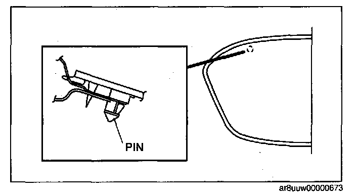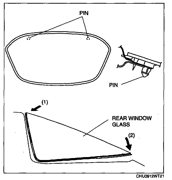 NOTE: If the rear window glass is tilted while inserting the pin into the body, the sealant will rub against the body flange, causing damage to the sealant. Do not tilt the rear window glass to the left or right while working.