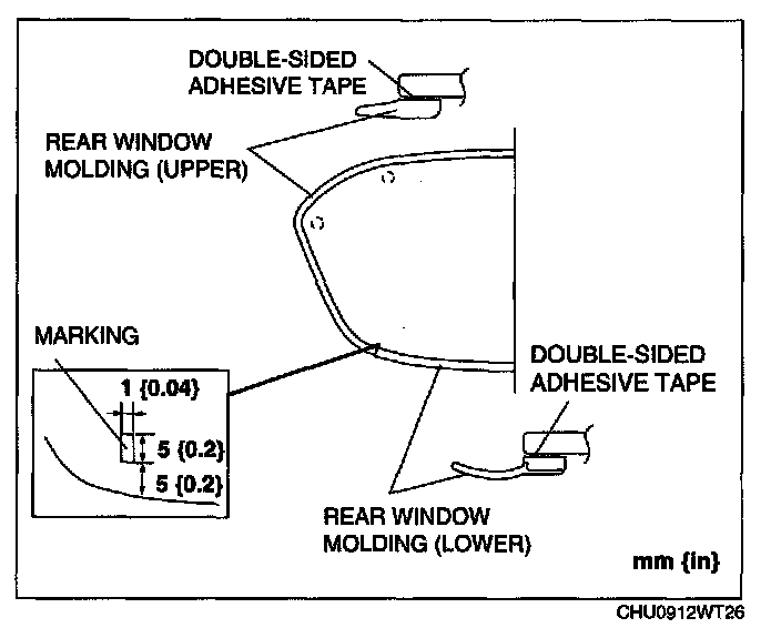 3. Remove the remaining double-sided adhesive tape from the rear window molding, and install the rear window molding (upper) to the rear window glass while aligning the molding with the center of the marking on the glass.