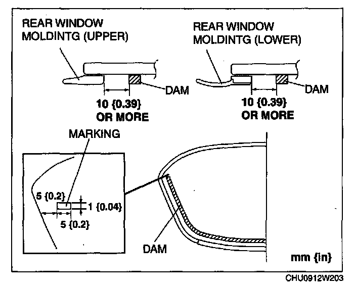 8. Position the marking on the rear window glass and the curved line of the body (roof molding) left and right so that they are aligned.