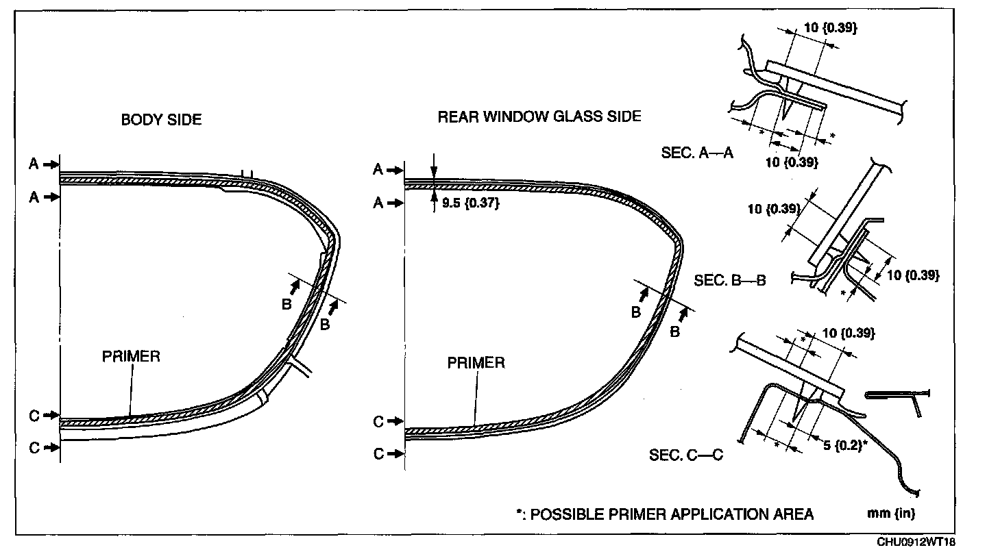 6. Use only glass primer on the rear window glass, and body primer on the rear window molding as shown in the figure. Allow it to dry for approx. 30 min.
