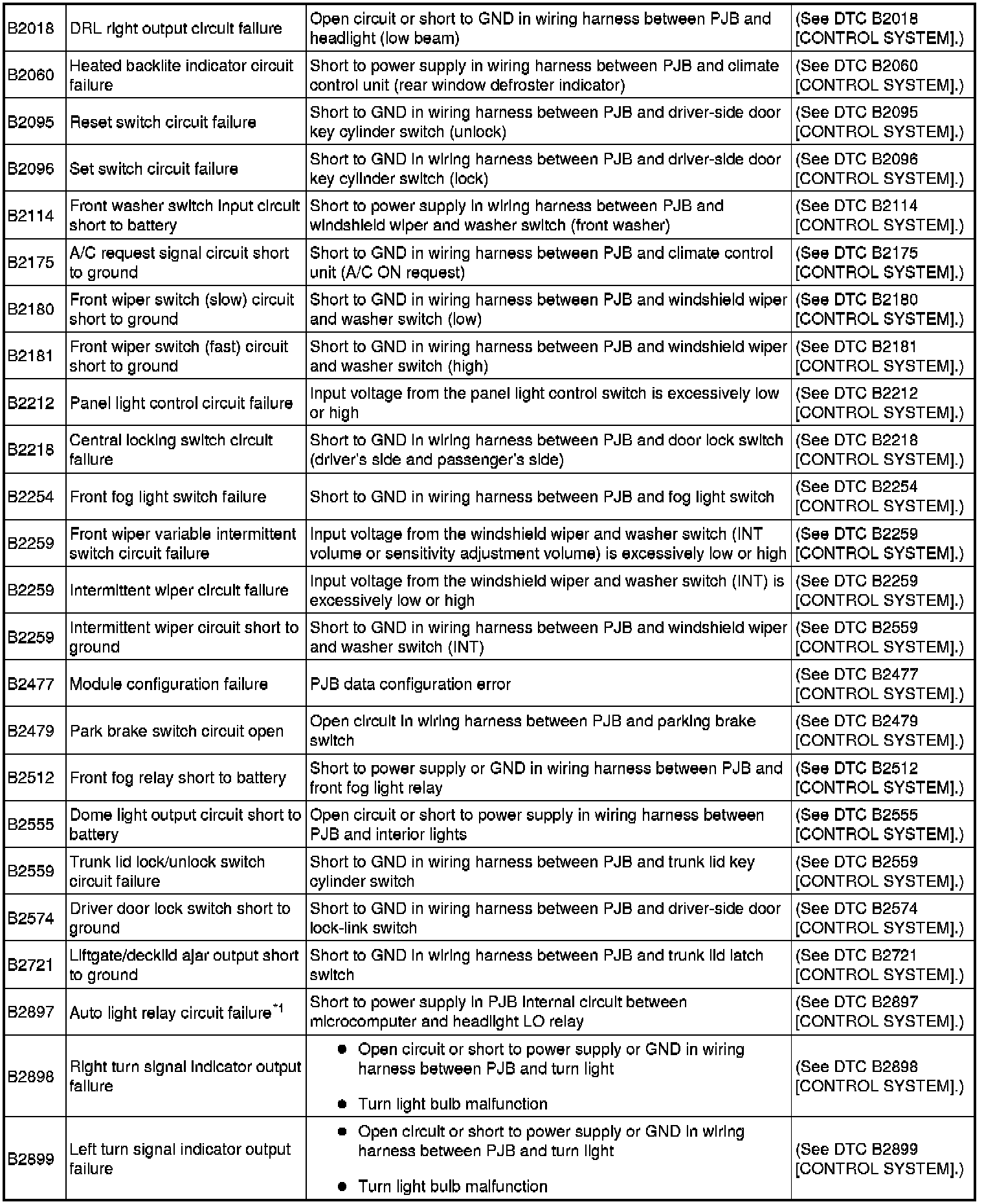DTC TABLE (PJB) [CONTROL SYSTEM]