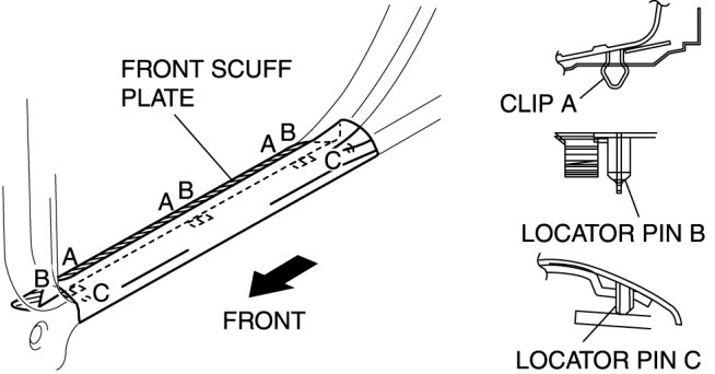 1. Pull the front scuff plate upward, detach clips A, locator pins B and C from the body, and then remove the front scuff plate.