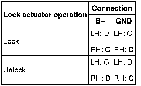 1. Apply battery positive voltage and connect ground to the corresponding front door lock actuator terminals, and inspect the front door lock actuator operation.