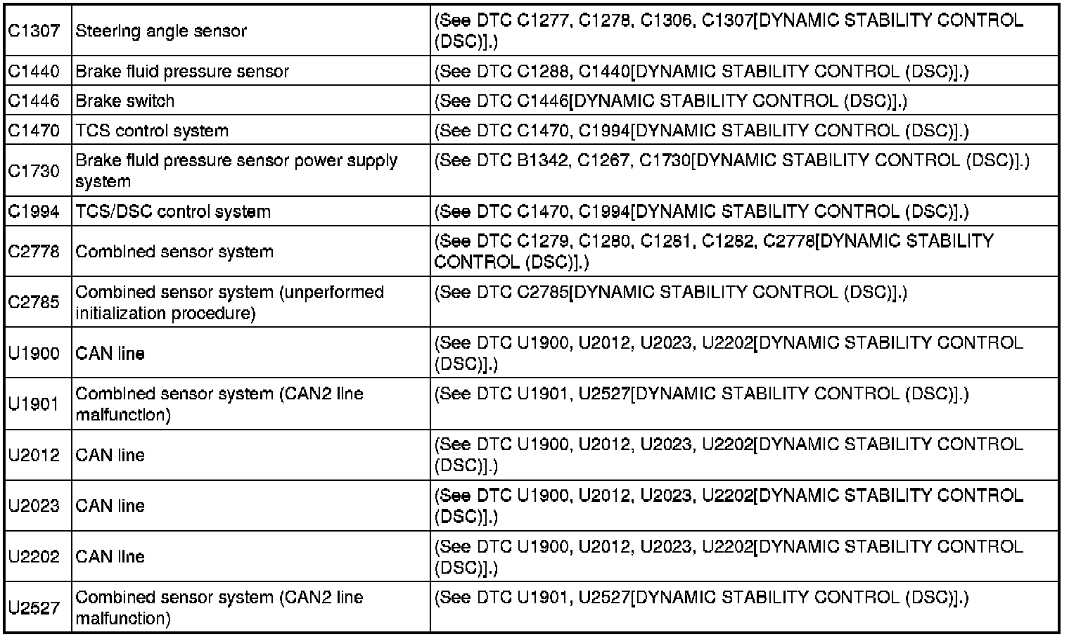 DTC Table Dynamic Stability Control (DSC)