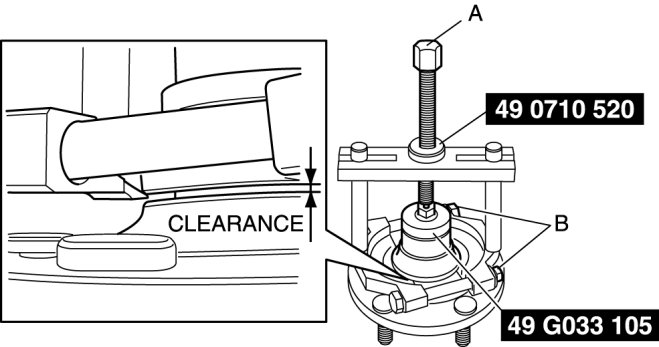 3. Tighten SST section A until the space between the bearing inner race and wheel hub component is 1-2 mm {0.04-0.07 in}.