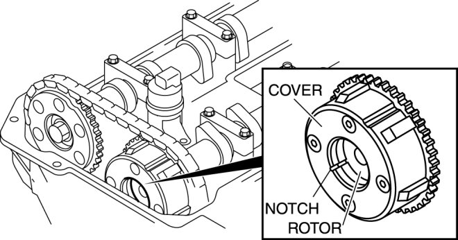 3. Confirm that notch of the rotor and bump of the cover at the variable valve timing actuator are aligned and fitted.