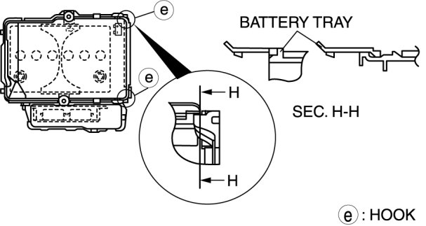 1. Assemble with battery box hooks E aligned with the battery tray holes at two points.