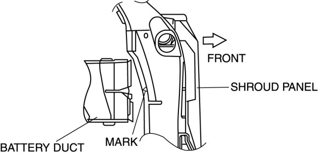 1. Align the mark of the shroud panel with notch in the battery duct, and install the battery duct to the shroud panel.
