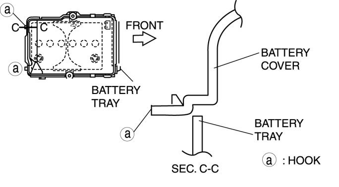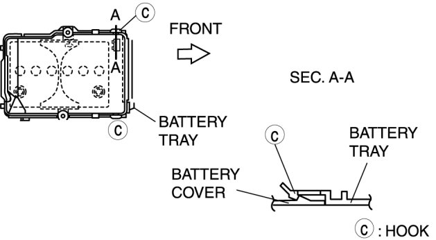 4. Set the battery cover to battery tray hooks C at two points.
