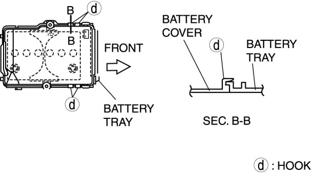 3. Install with battery cover hooks D aligned with the battery tray flange at four points.