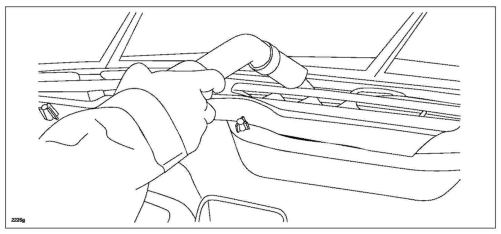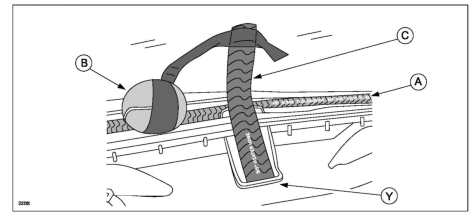 c. Center area: Press with rubber tube (C) using electrical tape to hold it in place between the dash panel center support (Y) and the windshield.