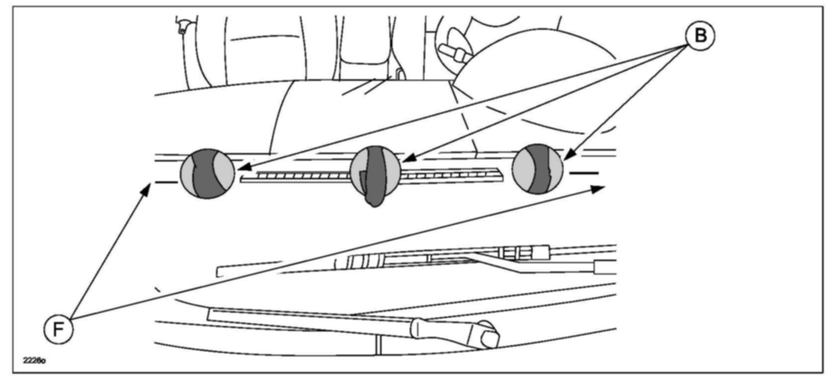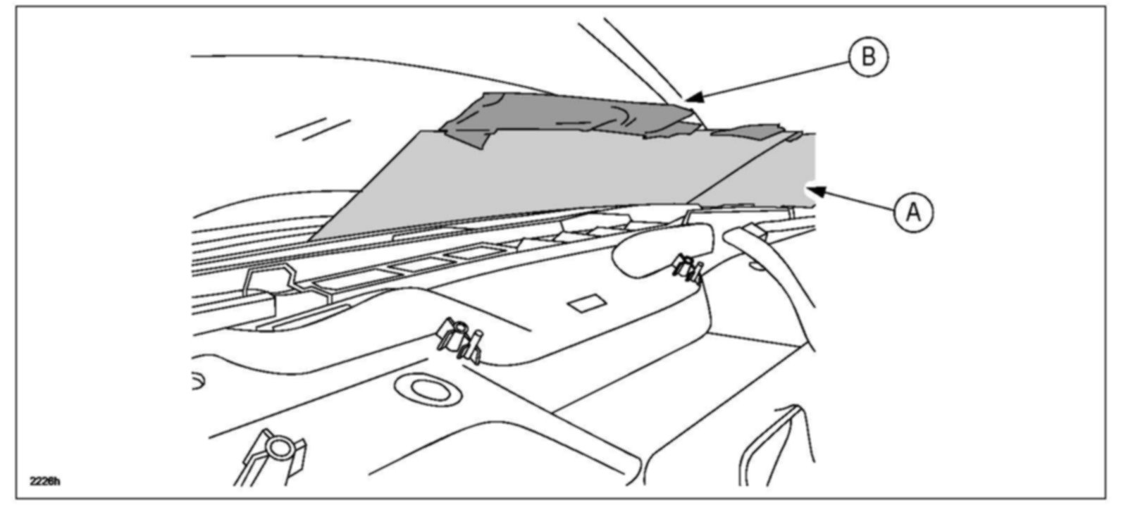 b. Center and side area: Push the tennis balls (B) between the windshield and the new panel.