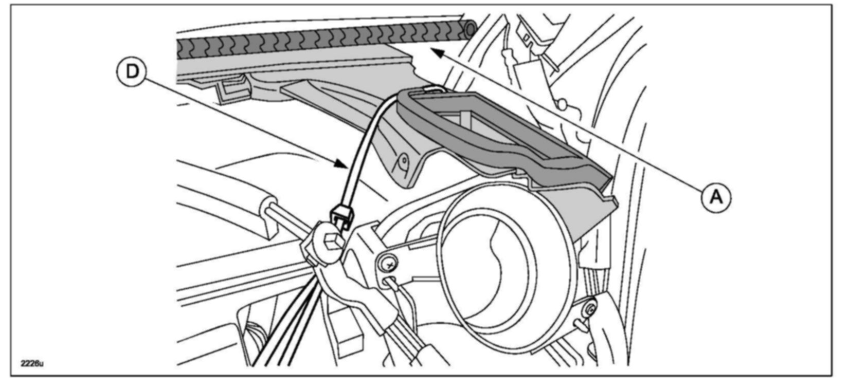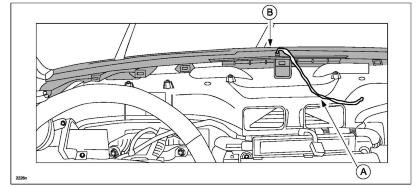 11. On vehicles equipped with auto A/C, pass the tape of the solar radiation sensor connector (A) through the hole of the new panel (B).