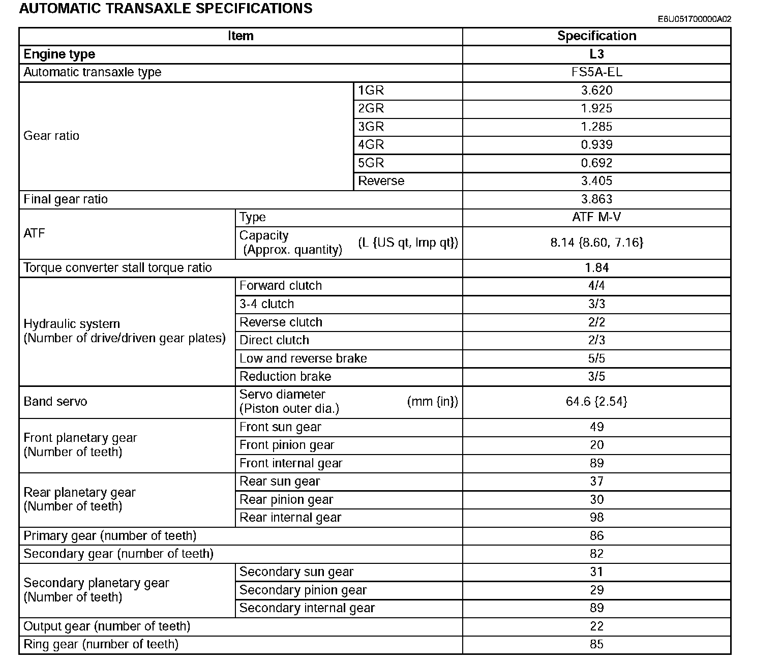Automatic Transaxle Specifications