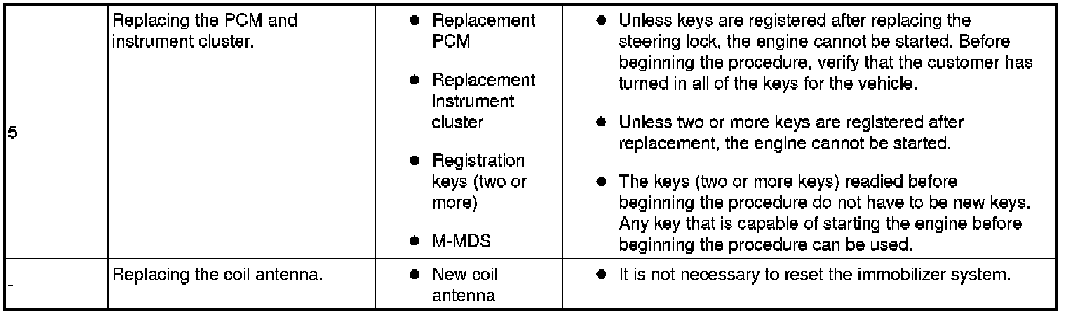 - When performing the following procedures, the immobilizer resetting procedure using the M-MDS must also always be performed: "instrument cluster replacement", "PCM replacement", "instrument cluster and PCM joint replacement", "Key ID number clearing". The engine will not start unless all work is performed using the M-MDS.