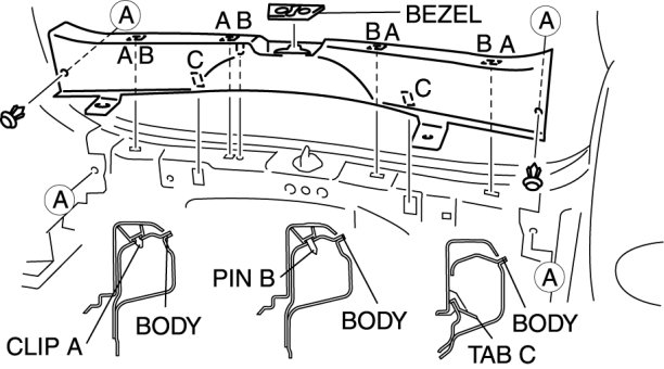 3. Pull the trunk end trim upward, then detach clips A, pins B, and tabs C.