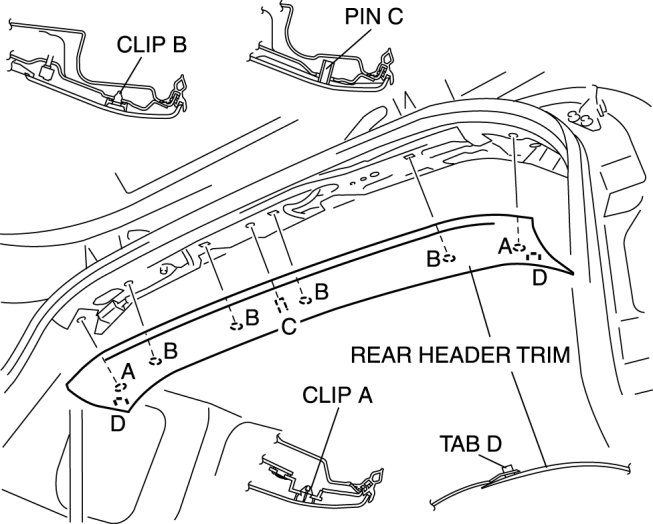 Pull the rear header trim and detach clips A and B, pin C, and tabs D.