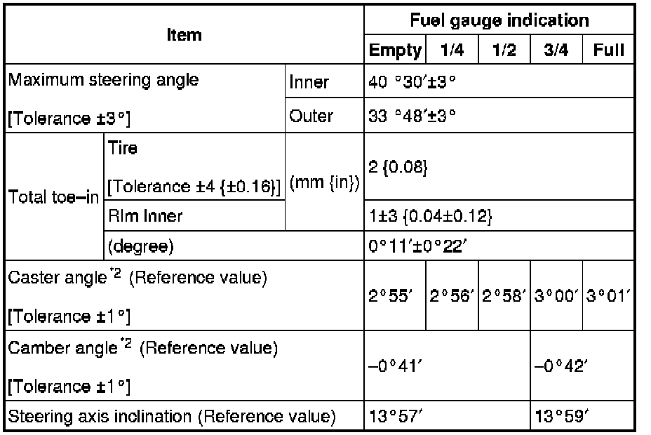 - Toe angle changes by approx. 6 mm {0.2 in} per one rotation of the tie rod for one wheel.