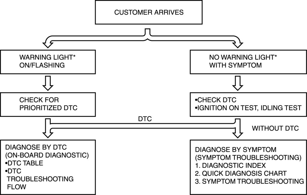- When the customer reports a vehicle malfunction, check the malfunction indicator lamp (MIL) indication and diagnostic trouble code (DTC), then diagnose the malfunction according to the following flowchart: