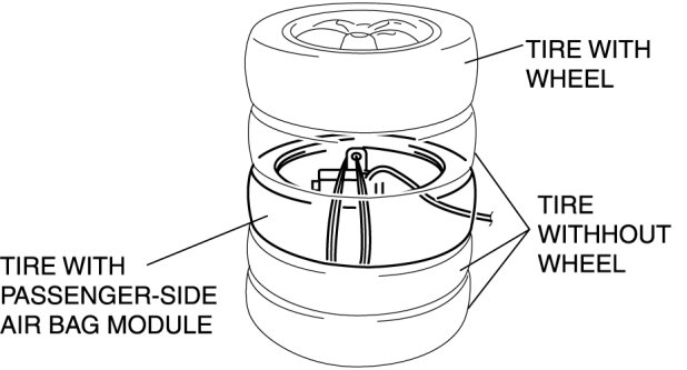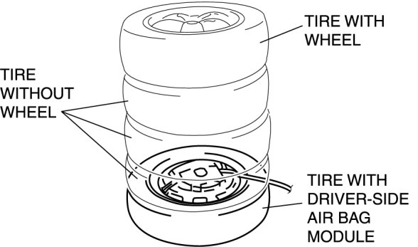4. Stack the tire with the passenger-side air bag module on top of two tires without wheels. Stack a tire without a wheel on top of the tire with the passenger-side air bag module, and then stack another tire with a wheel on the very top.