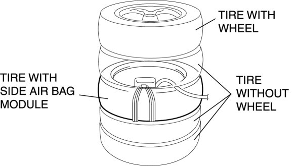 4. Stack the tire with the side air bag module on top of two tires without wheels. Stack a tire without a wheel on top of the tire with the side air bag module, and then stack another tire with a wheel on the very top.