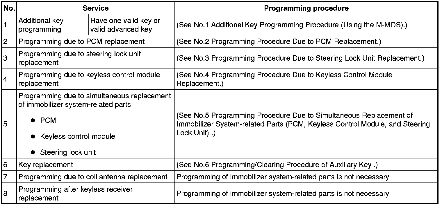 Immobilizer System-Related Parts Service and Programming Procedure Table