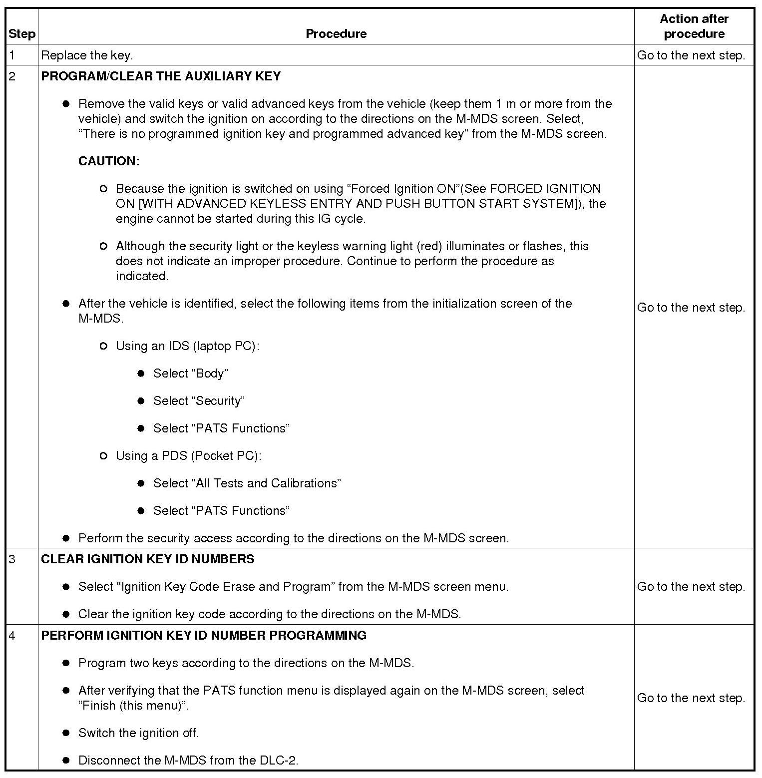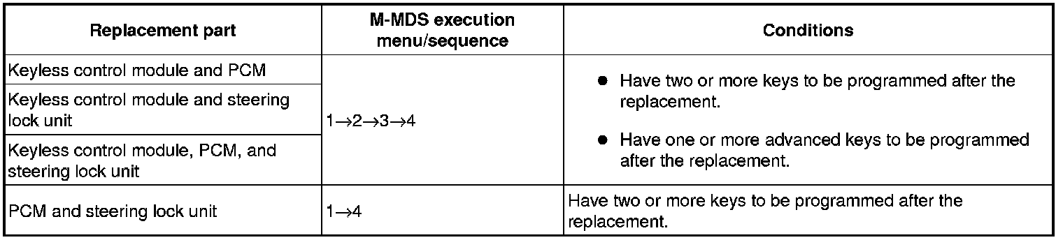 - When replacing the keyless control module or the steering lock, remove the valid keys or valid advanced keys from the vehicle (keep them 1 m or more from the vehicle) and switch the ignition on according to the directions on the M-MDS screen. Select, "There is no programmed ignition key and programmed advanced key" from the M-MDS screen.
