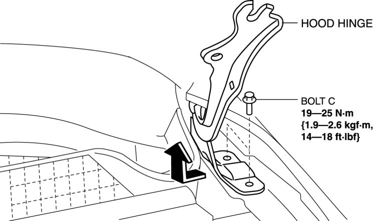 2. Remove bolt C, and remove the hood hinge in the direction of the arrow shown in the figure.