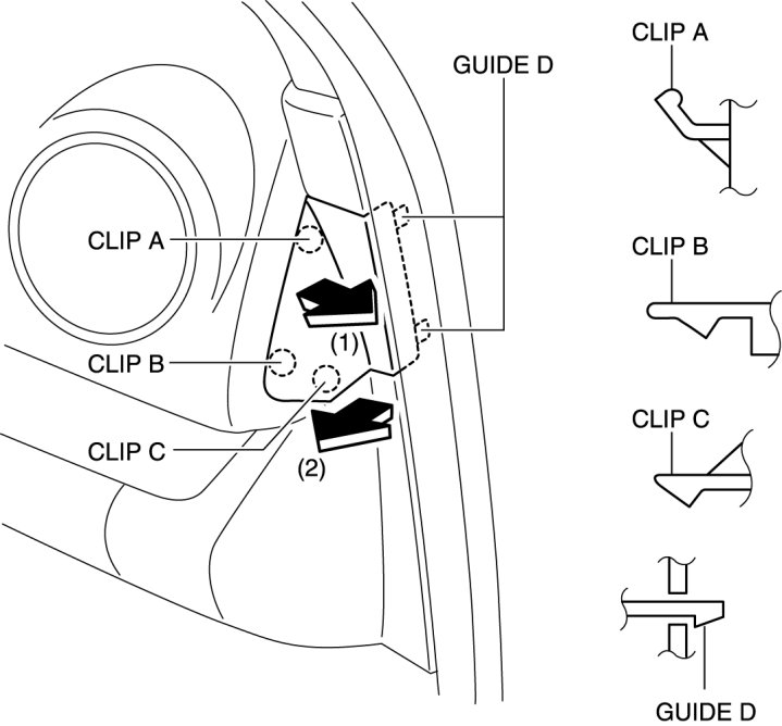1. Pull the side panel in the direction of the arrow in the order of (1) and (2), then remove it while detaching the clips A, B, C and guide.